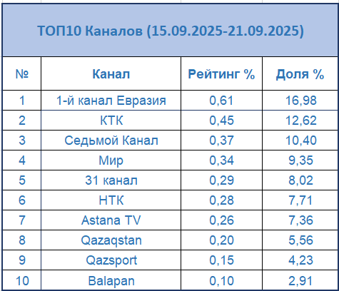 Қыркүйек айының үшінші аптасында қазақстандық телеаудиторияның әдеттегі көшбасшылары өз орындарын сақтап тұр. Дегенмен, НТК арнасы екі саты төмендеп, орнын «Мир» және «31 арна» иеленді. Көрермендер әдеттегідей кешкі жаңалықтар, отандық телехикаялар, қазақстандық фильмдер мен әлеуметтік-экономикалық бағдарламаларды жиі қараған.