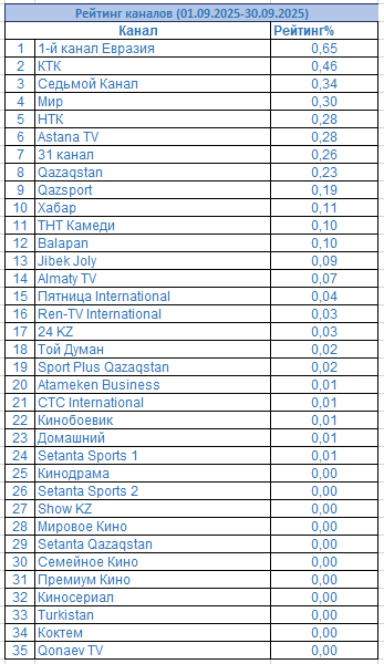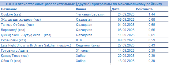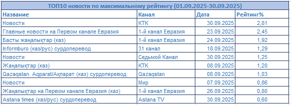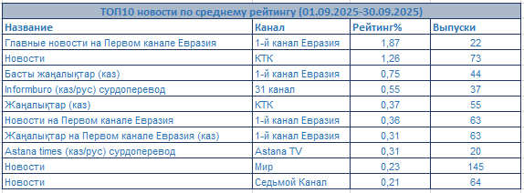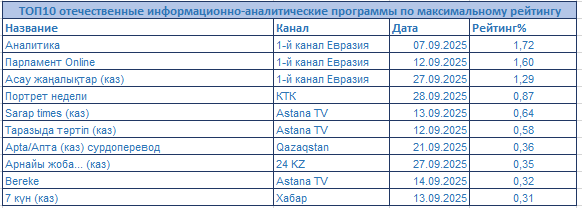 Информационные программы вновь заняли лидирующие позиции по охвату и рейтингу. На первом месте — «Главные новости» на Первом канале Евразия, с самым высоким средним рейтингом 1.87% (22 выпуска), Новости на КТК также показали стабильную популярность: 73 выпуска и средний рейтинг 1.26%. Казахоязычные выпуски «Басты жаңалықтар» и «Informburo» на 1-м канале Евразия и 31 канале соответственно вошли в топ-5 по популярности.