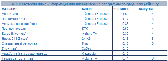Среди информационно-аналитических передач лидируют «Аналитика» и «Парламент Online» на Первом канале Евразия, с рейтингами 1.51% и 1.17%. Также в десятке — «Асау жаңалықтар» (ПКЕ), «Портрет недели» (КТК) и «Sarap times» (Astana TV), демонстрируя интерес аудитории к общественно-политическим темам.
