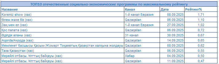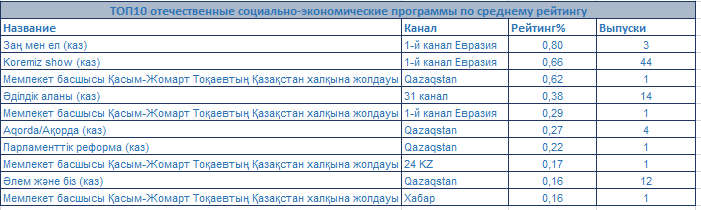 В категории социально-экономических программ лидирует «Koremiz show» и «Заң мен ел» на Первом канале Евразия, между ними расположилась «Әлем және біз» на Qazaqstan. Также в топе «Қос палата» (Qazaqstan) и «Әділдік алаңы» (31 канал). По среднему рейтингу за месяц также сразу три строчки заняло Послание Главы государства народу Казахстана.