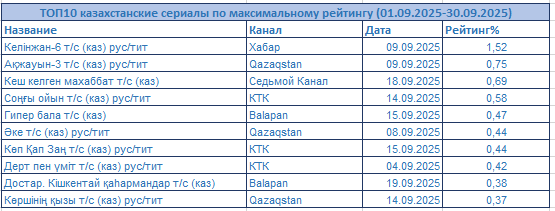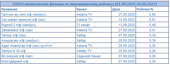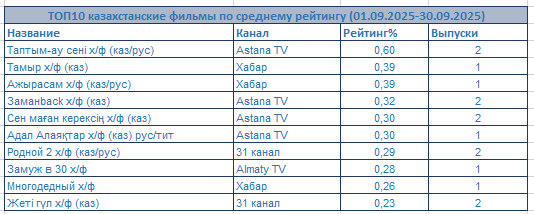 В сентябре казахстанские художественные фильмы заняли заметное место в телевизионной сетке, демонстрируя устойчивый интерес зрителей. Лидером по максимальному рейтингу стал фильм «Таптым-ау сені» на канале Astana TV. Фильм «Сен маған керексің» на том же канале показал хорошие результаты. Среди других популярных лент — «Ажырасам» и «Адал Алаяқтар» на Хабар и Astana TV, «Родной 2» на 31 канале, а также «Замуж в 30» на Almaty TV. Фильмы транслировались преимущественно в выходные дни, охватывая темы любви, семьи, социальных конфликтов и юмора. Это подтверждает интерес аудитории к казахстанским историям, отражающим повседневную жизнь и культурные реалии.