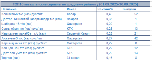 Казахстанские сериалы продолжают удерживать внимание зрителей. «Келінжан-6» на Хабар стал самым просматриваемым сериалом месяца — 52 эпизода и средний рейтинг 0.45%. За ним следуют «Ақжауын-3» на Qazaqstan (0.27%, 42 серии) и «Кеш келген махаббат» на Седьмом канале (0.28%, 21 эпизод).