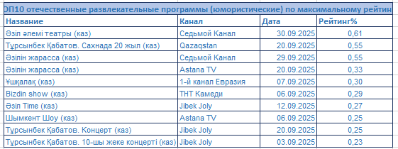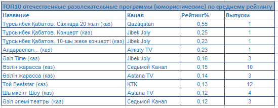 Наибольший рейтинг среди юмористических программ получили «Әзіл әлемі театры» на Седьмом канале и Турсынбек Кабатов (Qazaqstan, Jibek Joly). Такие программы стабильно удерживают внимание зрителей благодаря узнаваемым артистам и локальному юмору.