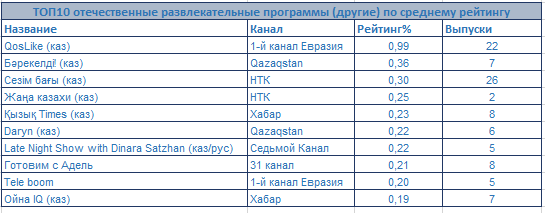 Среди развлекательных лайфстайл-шоу лидером стал «QosLike» на Первом канале Евразия — с самым высоким средним рейтингом в категории (0.98%) и 22 трансляциями за месяц. Также в топ вошел «Late Night Show with Dinara Satzhan» на Седьмом канале, набравший 0.22% среднего рейтинга. Программа «Готовим с Адель» на 31 канале также отметилась стабильными показателями (0.21%).