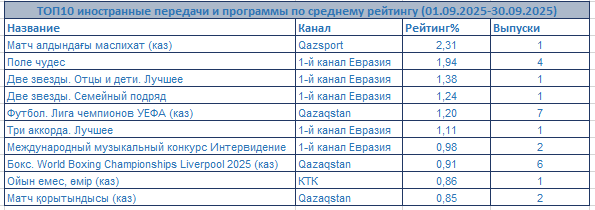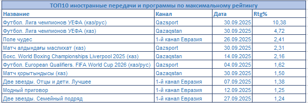 Среди иностранных передач в сентябре значительное внимание зрителей привлекла футбольная трансляция Лиги чемпионов УЕФА, матч 30 сентября на телеканалах QazSport (10,38% и Qazaqstan (4,72%). Также в десятку вошли такие спортивные программы как трансляция матча отборочного этапа к чемпионату мира по футболу FIFA 2026 года и чемпионат мира по боксву World Boxing Championships Liverpool 2025.