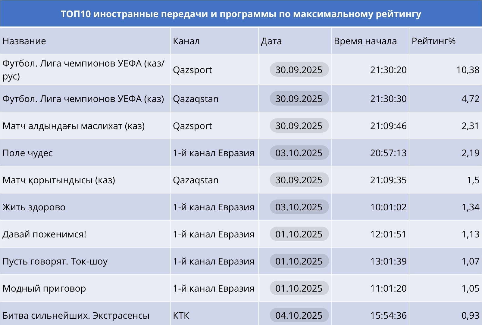 И наконец, спортивный блок: трансляции Лиги чемпионов УЕФА на Qazsport и Qazaqstan собрали рекордные цифры — более 10 пунктов рейтинга. Это абсолютный максимум недели и событие, которое объединяет страну.