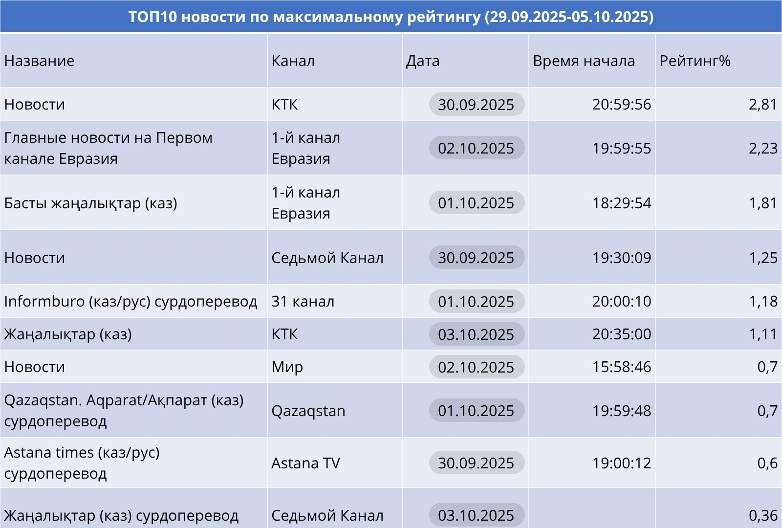 Начало октября на казахстанском ТВ прошло под знаком устойчивых лидеров и новых акцентов. Информационные программы по-прежнему удерживают внимание зрителей: «Новости» на КТК вновь показали самый высокий рейтинг недели — 2.81%, а «Главные новости» на Первом канале Евразия уверенно закрепились на втором месте. Выпуски «Басты жаңалықтар» (ПКЕ) и «Informburo» (31 канал) также вошли в топ, подтверждая интерес аудитории к обзору событий на родном языке. Новости на Седьмом канале изменили привычную расстановку в стабильной первой пятёрке.
