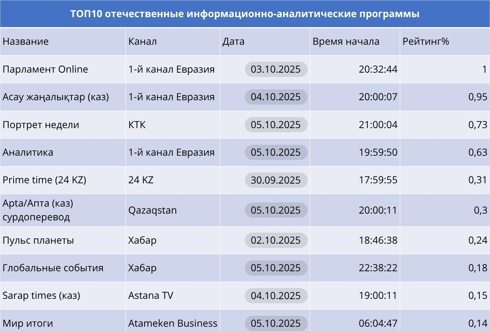 В аналитическом сегменте — без сюрпризов. «Парламент Online», «Аналитика» и «Асау жаңалықтар» на Первом канале Евразия продолжают задавать тон, а «Портрет недели» на КТК стабильно в первой пятерке. Новичок недели в топе – «Мир итоги» на Atameken Business.