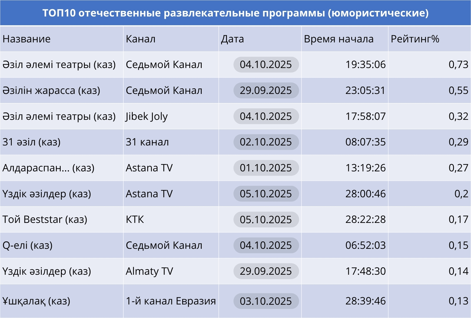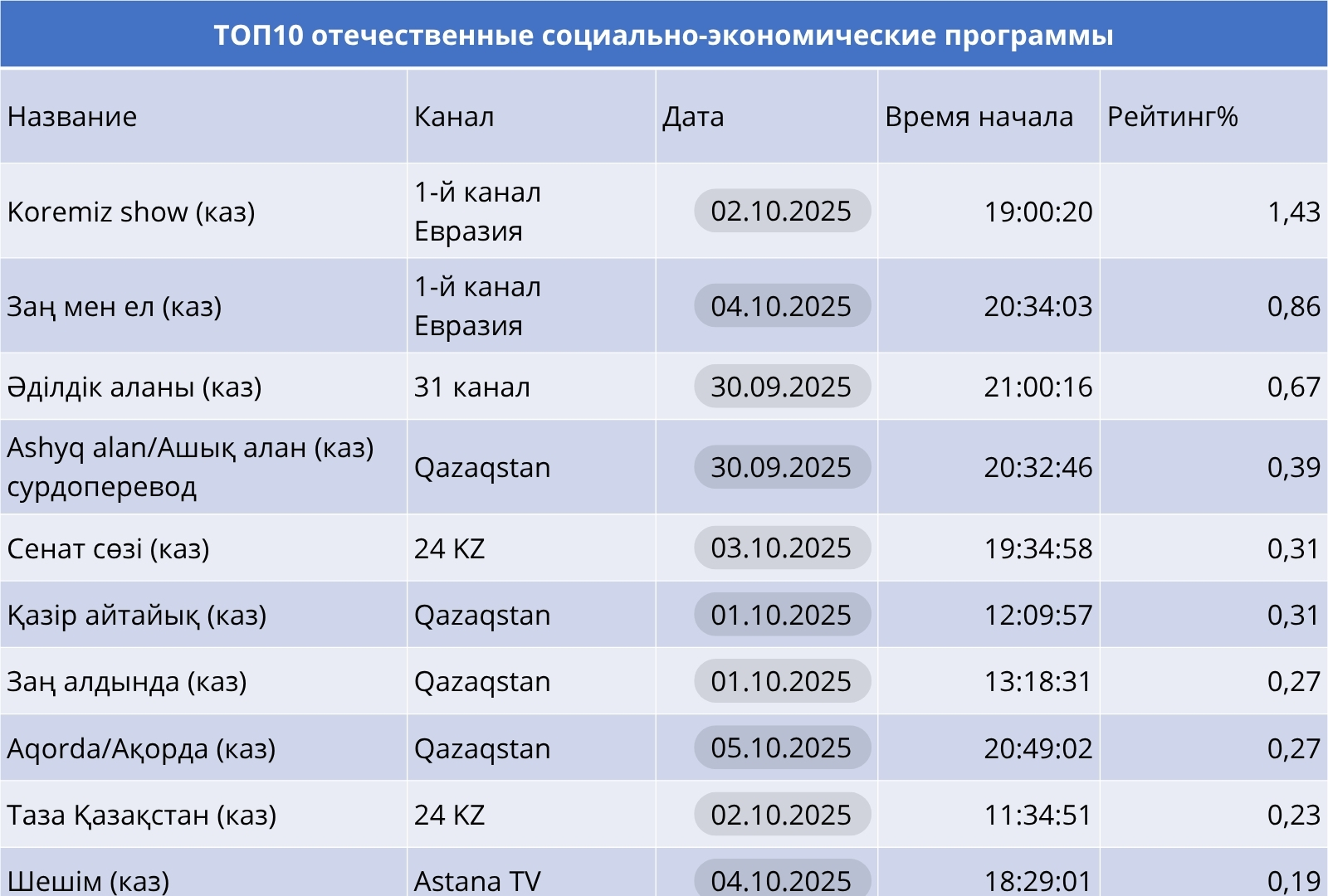 Социально-экономические проекты продолжают набирать силу. «Koremiz show» и «Заң мен ел» на Первом канале Евразия, а также «Әділдік алаңы» на 31 канале — в числе самых просматриваемых. Это подтверждает, что зрителю важны не только эмоции, но и диалог о реальных проблемах.