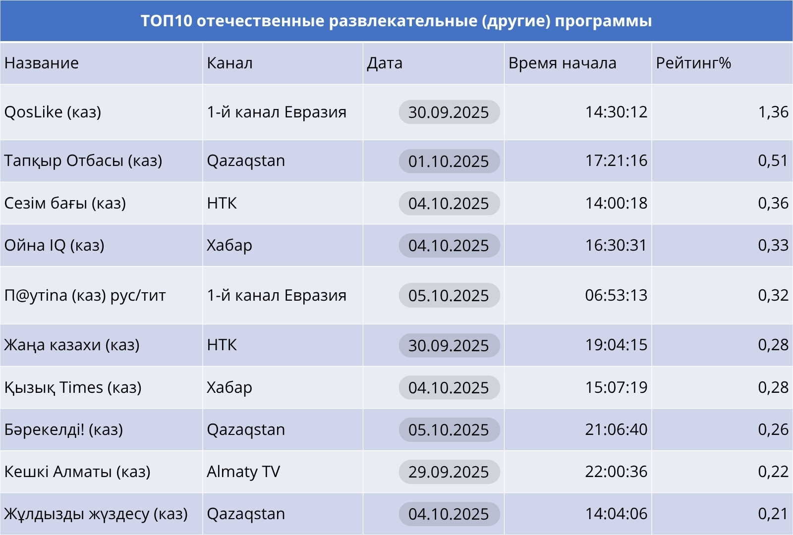 Развлекательный сегмент по-прежнему является эмоциональной потребностью у телезрителей, особенно в вечернем эфире. В лайфстайл-направлении — «QosLike» на Первом канале Евразия остаётся флагманом, интерес у аудитории и к интеллектуальным программам «Тапқыр Отбасы» (Qazaqstan) и Ойна IQ (Хабар). А такие программы как «Бәрекелді!» и «Жұлдызды жүздесу» на Qazaqstan, «Кешкі Алматы» на Almaty TV рассказывают о жизни популярных казахстанцев, тем самым привлекая свою аудиторию. Музыкальные программы вновь подтвердили статус народного формата.