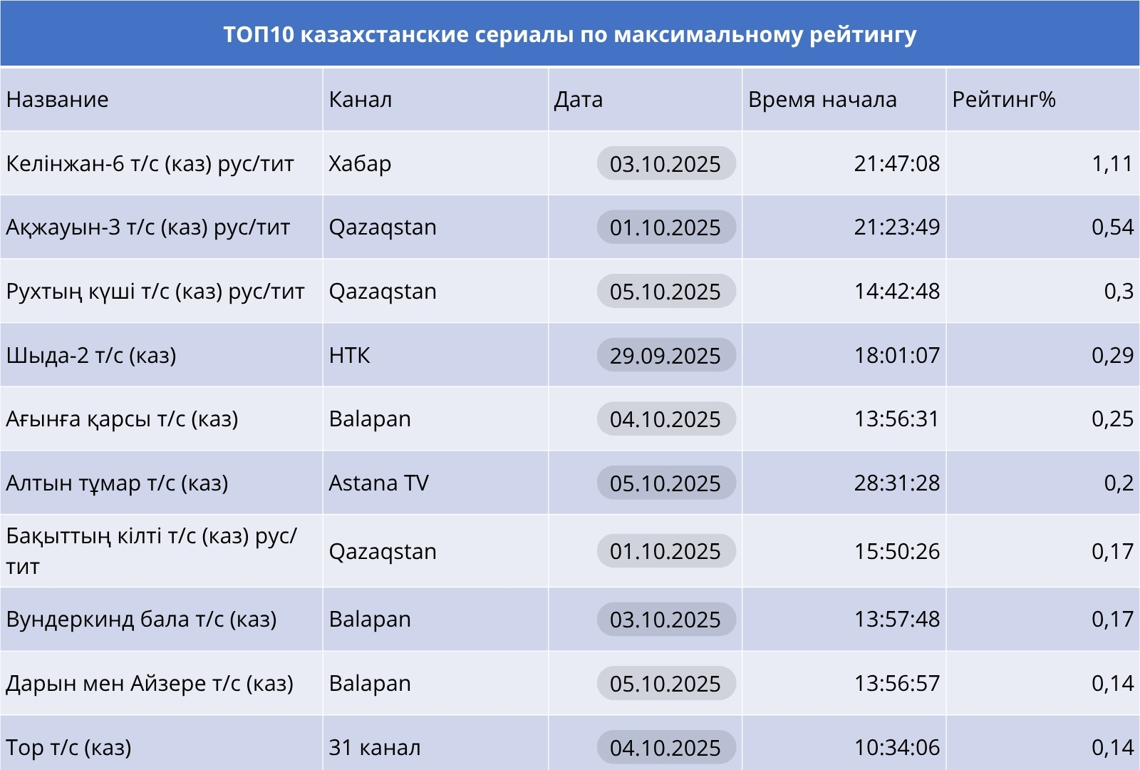 Среди сериалов отечественного производства — безоговорочные лидеры «Келінжан-6» на Хабаре и «Ақжауын-3» на Qazaqstan. Детские и молодёжные сериалы на Balapan также отметились в рейтингах, что подчёркивает устойчивый интерес к семейному просмотру.