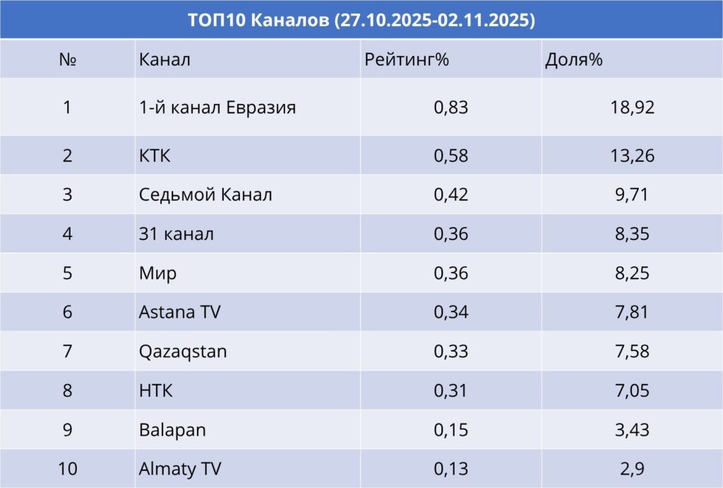 Первый канал Евразия уверенно лидирует по рейтингу и доле аудитории, охватывая почти 19% телесмотрения. КТК и Седьмой Канал занимают второе и третье места, предлагая широкий спектр контента — от новостей до юмора.