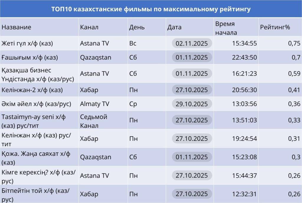 «Жеті гүл» на Astana TV и «Ғашығым» на Qazaqstan — самые популярные фильмы недели. Astana TV и Хабар предлагают комедии и драмы («Қазақша бизнес Үндістанда», «Келінжан»), отражая разнообразие жанров.