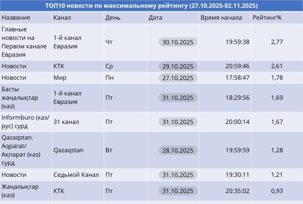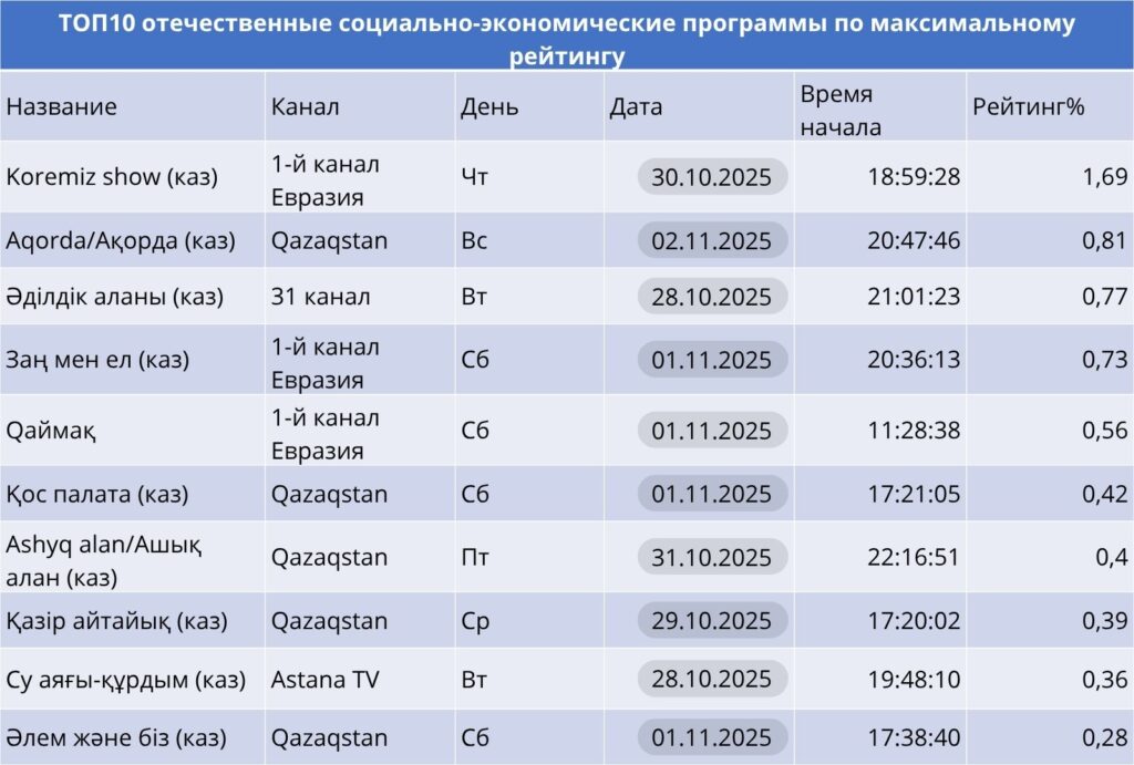 «Koremiz show» на Первом канале Евразия — абсолютный лидер (1.68%), благодаря формату прямого диалога и обсуждению острых тем. Qazaqstan и 31 канал активно продвигают правовые и политические форматы: «Ақорда», «Әділдік аланы», «Ashyq alan».