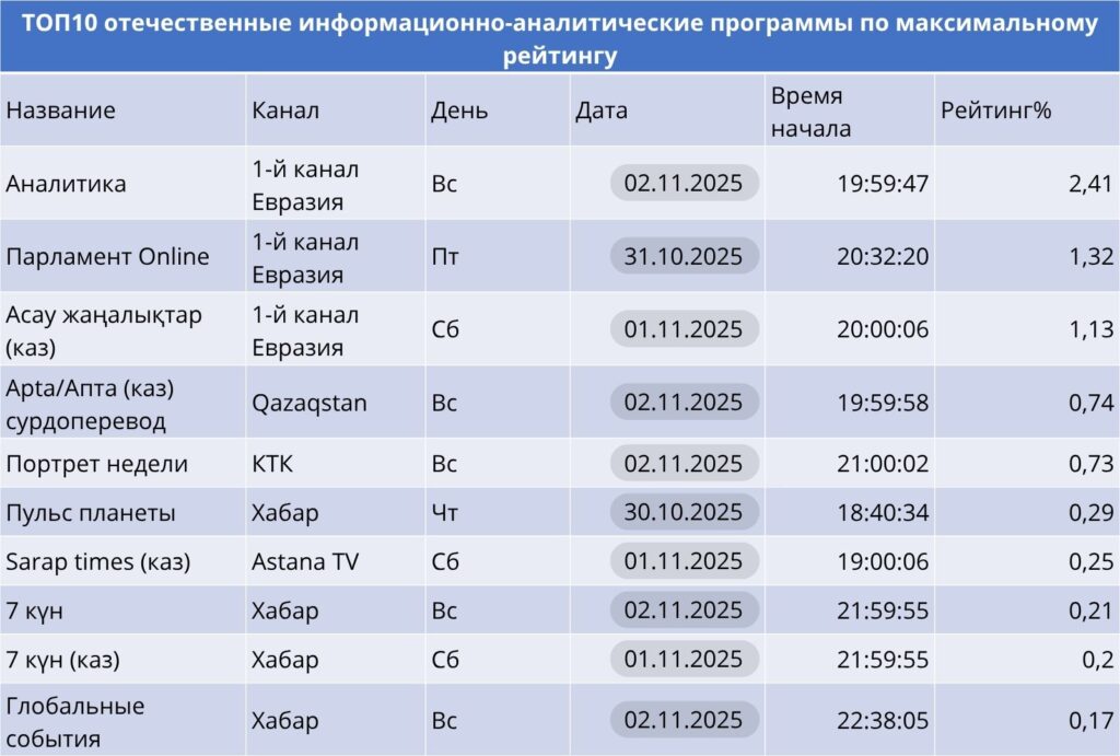 «Парламент Online» и «Асау жаңалықтар» постоянные лидеры категории, демонстрируя интерес к политическим и общественным темам. Qazaqstan и Хабар представлены программами «Апта», «7 күн», «Глобальные события», что подтверждает их роль в формировании общественного дискурса.