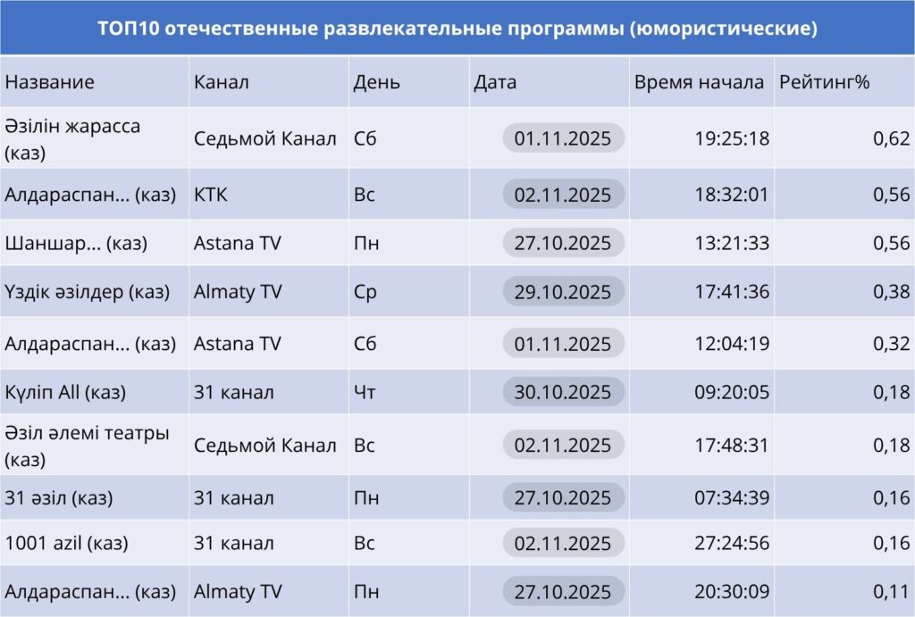 Среди развлекательных юмористических программ лидирует «Әзілін жарасса» на Седьмом Канале (0.62%), предлагая зрителям лёгкий вечерний контент. КТК и Astana TV продолжают традицию казахстанского юмора с программами «Алдараспан» и «Шаншар».