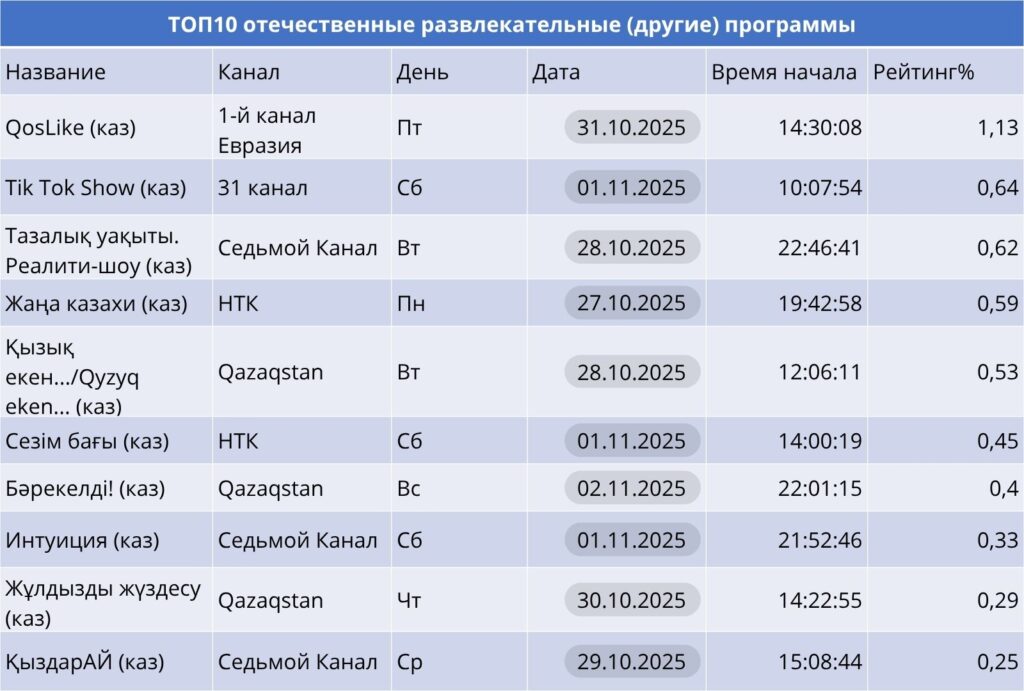 В этой категории доминирует «QosLike» на Первом канале Евразия — 1.13%, за счёт интерактивного формата и вовлечённости зрителей. В первой тройке также «Tik Tok Show» на 31 канале и «Тазалық уақыты» на Седьмом отражают интерес к молодежным и реалити-форматам.