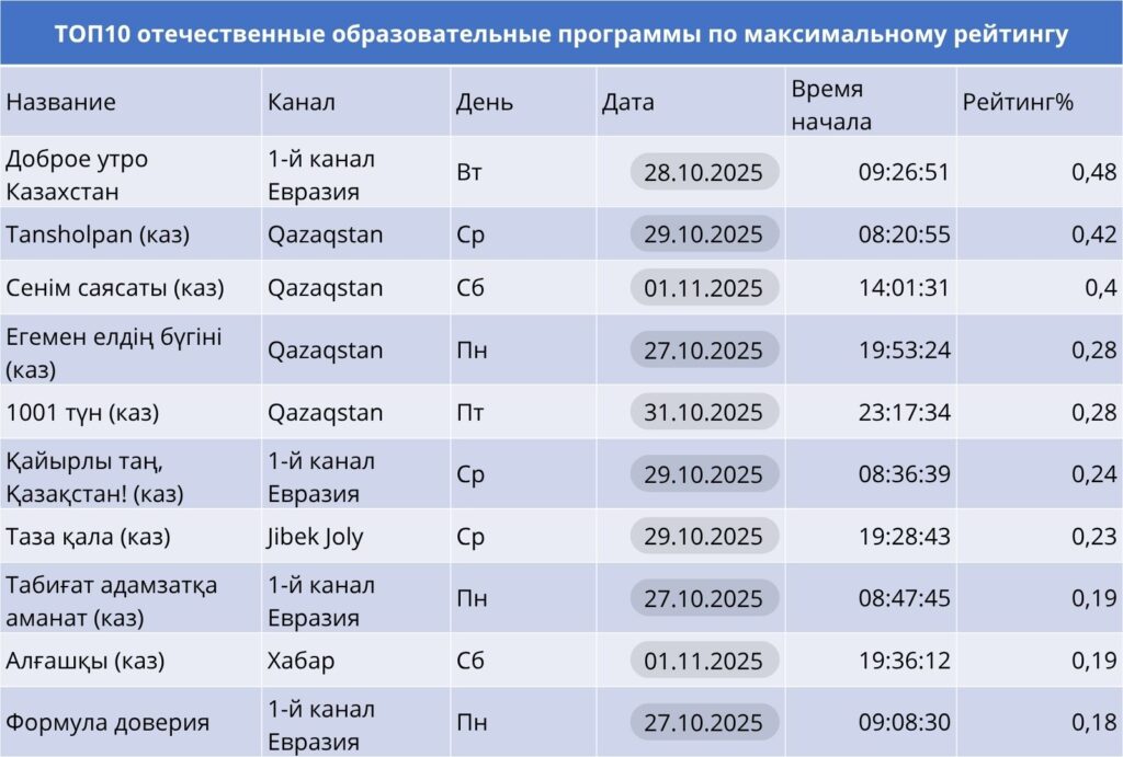 «Доброе утро Казахстан» на Первом канале Евразия — лидер с рейтингом 0.48%, подтверждая популярность утреннего формата. Qazaqstan активно развивает познавательные программы: «Tansholpan», «Сенім саясаты», «1001 түн» — охватывают темы культуры, истории и здоровья.