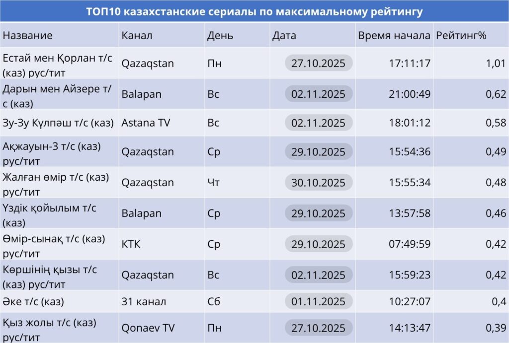 «Естай мен Қорлан» на Qazaqstan — лидер недели (1.01%), отражая интерес к историко-романтическим сюжетам. Balapan и Astana TV предлагают подростковые и семейные сериалы («Дарын мен Айзере», «Зу-Зу Күлпәш»). Сериалы с русскими титрами и сурдопереводом — важный шаг к доступности контента.