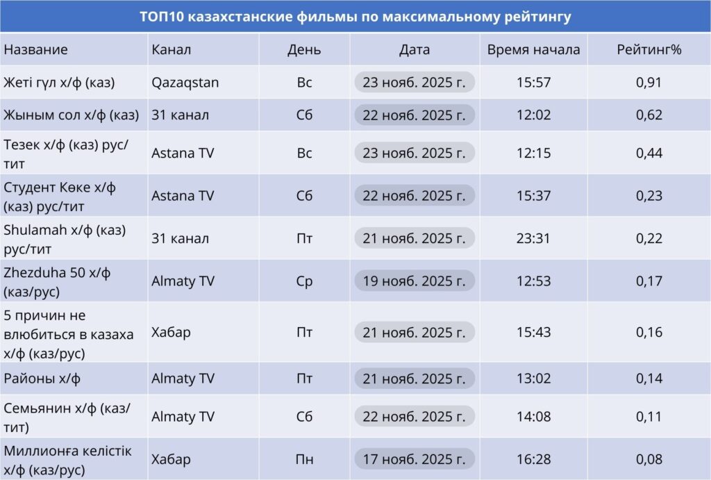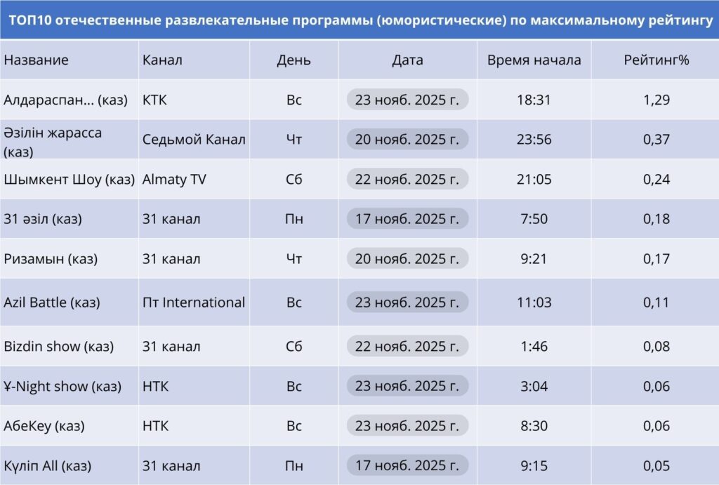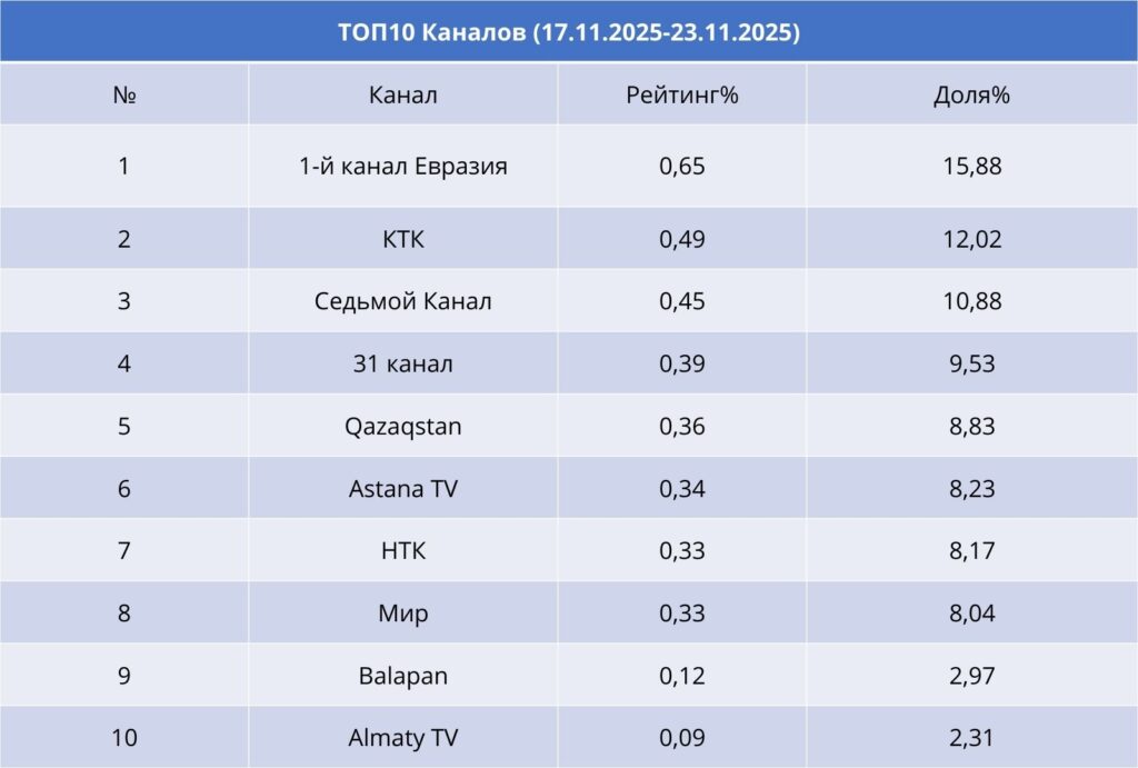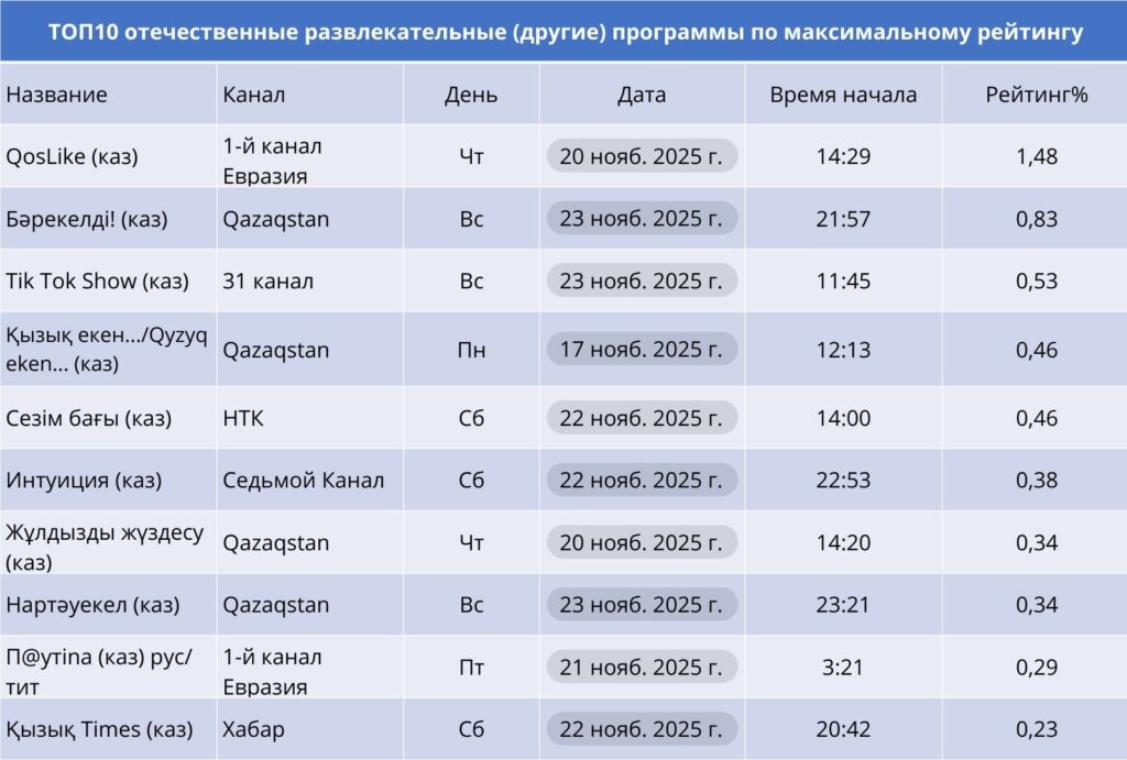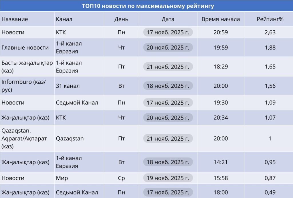 В новостном сегменте неделя прошла без сюрпризов — признанные лидеры вновь подтвердили свои позиции. Традиционные вечерние выпуски удержали внимание аудитории, оставаясь главным источником доверия и оперативной информации. Казахоязычные программы и форматы с сурдопереводом подчеркнули значимость доступности контента.