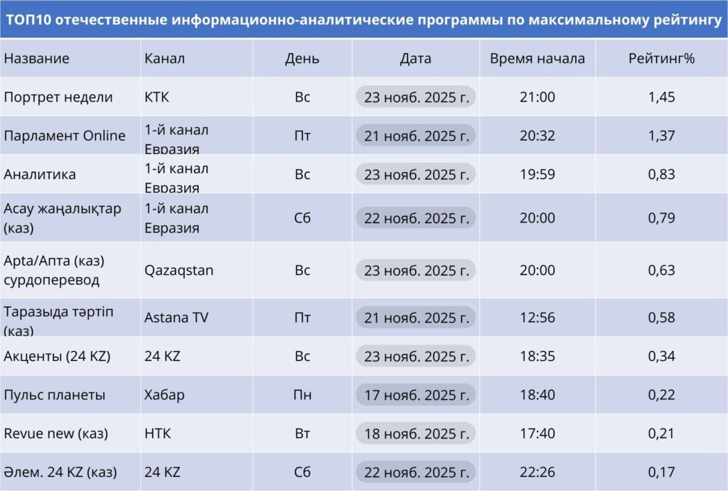 Блок уверенно возглавил тяжеловес отечественного телевидения — программа «Портрет недели» на КТК, подтверждая статус одного из главных аналитических проектов. Сразу три позиции занял Первый канал Евразия: «Парламент Online», «Аналитика» и «Асау жаңалықтар» — каждая из этих передач по‑своему раскрыла актуальные темы, от парламентских дискуссий до авторских обзоров.