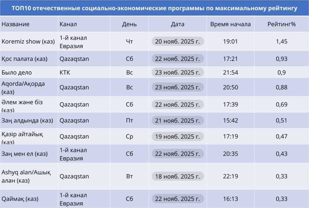 Этот блок собрал разнообразных лидеров жанра, каждый из которых по‑своему удерживает внимание аудитории. Неизменным фаворитом остаётся «Koremiz show» на Первом канале Евразия — проект, прочно закрепившийся в нише познавательных передач. «Қос палата» на Qazaqstan выступает мостом между парламентскими дискуссиями и обществом, переводя сложные законодательные процессы на доступный язык. КТК вошёл в топ с передачей «Было дело», удачно объединяющей документальный стиль и социальную публицистику.