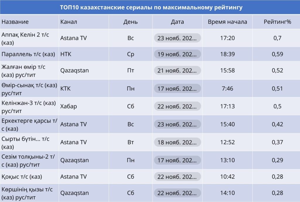 Первое место занял «Аппақ Келін 2» на Astana TV, подтвердив устойчивый интерес аудитории к семейной драме. Вторым стал новичок рейтинга НТК с криминальным сериалом «Параллель». Замыкает тройку «Жалған өмір» на Qazaqstan, сохранивший внимание своей постоянной аудитории.