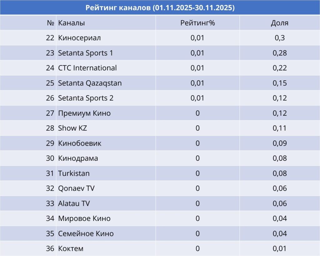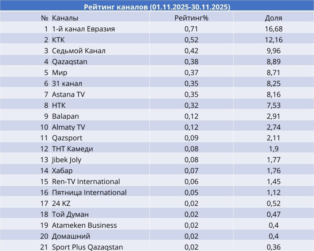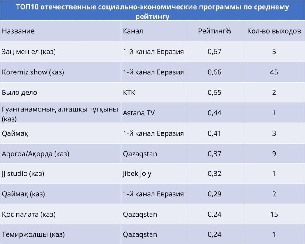 В ноябре социально‑экономические программы показали устойчивую картину. Лидирующие позиции удерживал Первый канал Евразия — его проекты выходили регулярно и собирали заметную аудиторию, особенно «Koremiz show» с самым большим количеством выпусков и «Заң мен ел» как более редкий, но рейтинговый формат.