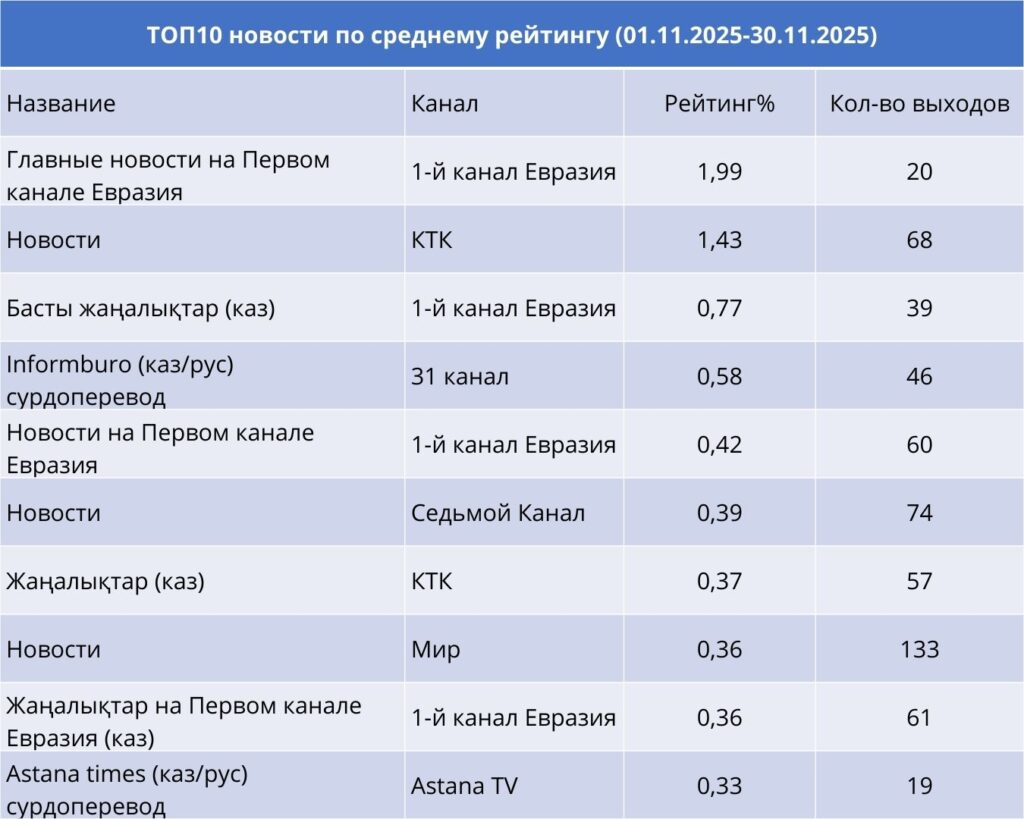 В ноябре уверенно лидировали «Главные новости» на Первом канале Евразия — они стали самой рейтинговой новостной программой, при этом вышли двадцать раз за месяц. Наряду с ними заметную аудиторию удерживали и казахскоязычные выпуски «Басты жаңалықтар» на Евразии, которые выходили регулярно и суммарно составили тридцать девять выпусков. На втором месте по популярности оказались «Новости» на КТК, которые выходили ежедневно и суммарно дали шестьдесят восемь выпусков. Эти три бренда фактически задавали тон всему новостному вещанию.