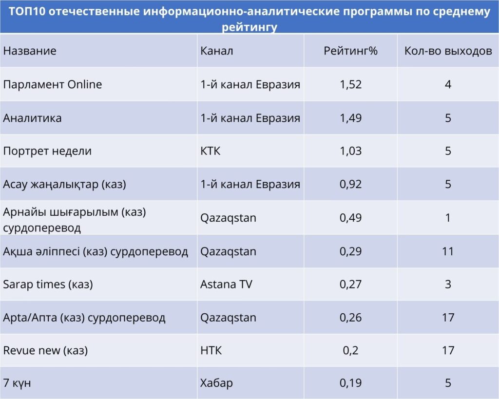 Здесь доминировали проекты Первого канала Евразия — «Парламент Online» с 4 выпусками и «Аналитика» с 5 выходами, которые показали устойчивый интерес аудитории. На КТК высоко оценили «Портрет недели», вышедший 5 раз. В сегменте казахскоязычных передач выделялись «Асау жаңалықтар» на Евразии (5 выпусков) и «Апта» на Qazaqstan (17 выпусков).