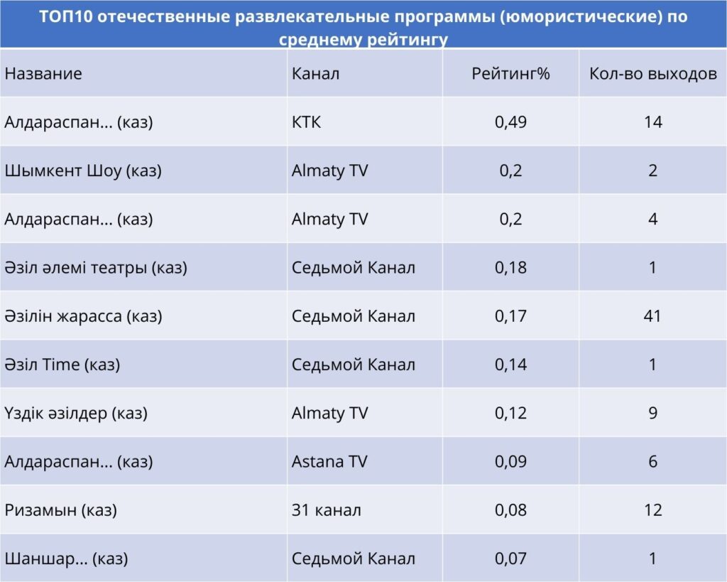Лидером категории стал «QosLike» на Первом канале Евразия, который выходил регулярно и суммарно дал двадцать выпусков, обеспечив высокий средний рейтинг. На канале Qazaqstan заметно выделялись «Бәрекелді!» с тринадцатью выходами и «Қызық екен…», показанный двадцать один раз. Эти проекты укрепили позиции канала в развлекательном сегменте. В первую тройку вошел 31 канал с тремя выпусками «Әділдік аланы».