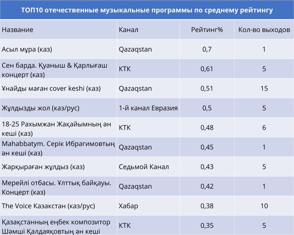 На канале Qazaqstan внимание аудитории привлекли культурные проекты: «Асыл мұра» вышел один раз и собрал высокий отклик, а «Ұнайды маған cover keshi» транслировался регулярно, пятнадцать раз за месяц, обеспечив стабильное присутствие в эфире. КТК сделал ставку на концертные вечера. «Сен барда. Қуаныш & Қарлығаш» вышел пять раз, «18–25. Рахымжан Жақайымның ән кеші» транслировался шесть раз, а концерт памяти Шәмші Қалдаяқова показали пять раз. Хабар удерживал внимание аудитории благодаря проекту «The Voice Казахстан», который выходил десять раз и стал одним из самых регулярных музыкальных форматов месяца.