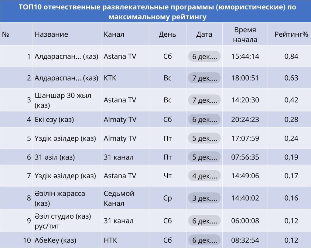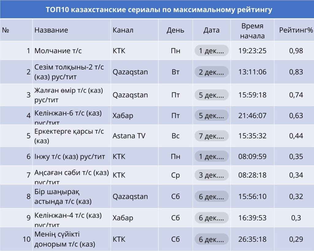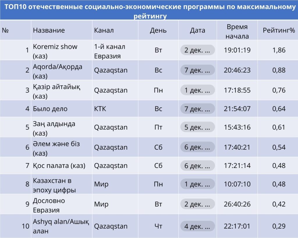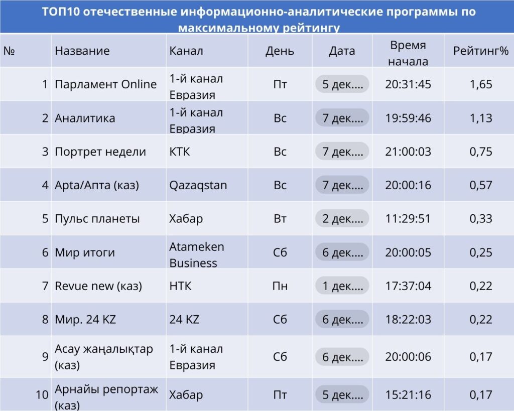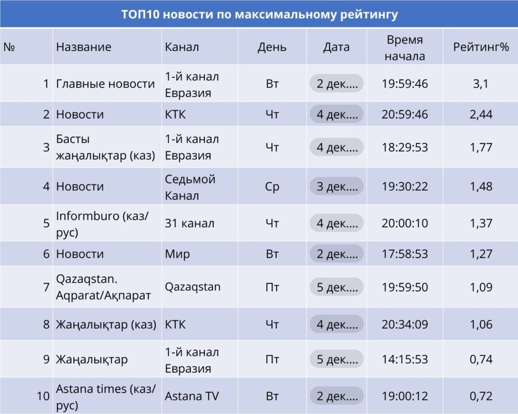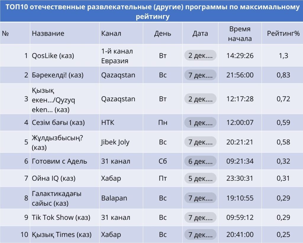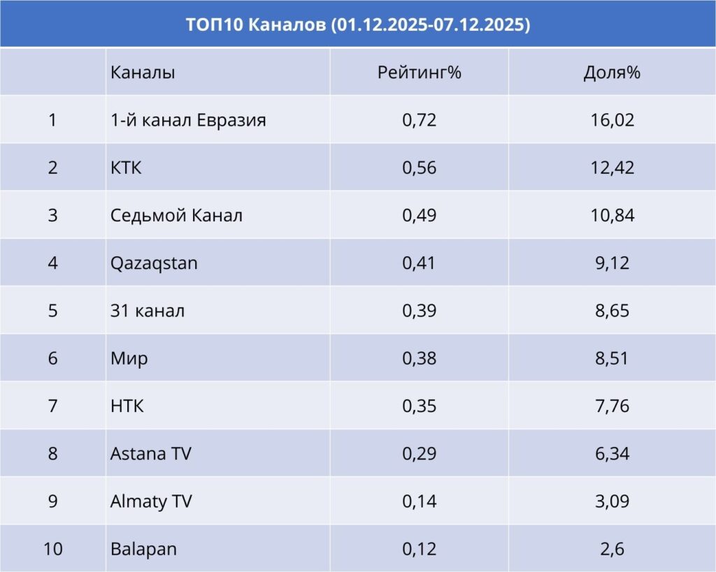 В первую неделю декабря зрительское поведение оставалось стабильным, а основные каналы сохранили привычные позиции. Мир спустился на 2 строки, уступив место каналам Qazaqstan и 31. Astana TV также потерял 2 позиции по сравнению с предыдущей неделей.