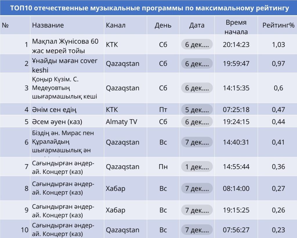 Концертные форматы и творческие вечера привлекли внимание зрителей, а регулярные музыкальные передачи показали стабильную динамику. Лидер категории на неделе юбилейный концерт Макпал Жунусовой на КТК. Наибольшее количество строчек в рейтинге занял Qazaqstan.
