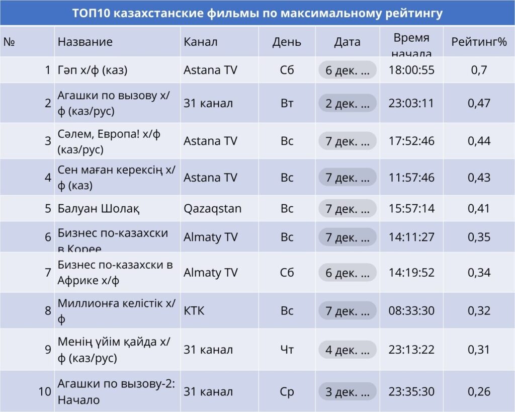 Кинослоты выходных дней обеспечили дополнительный интерес аудитории. Отечественные фильмы разных жанров, а особенно вечерние показы стали точками притяжения зрителей. Сразу по три строчки в рейтинге заняли Astana TV и 31 канал.