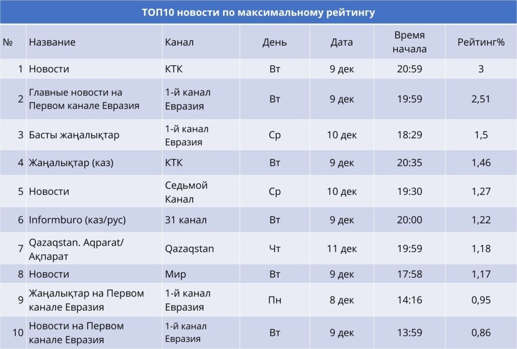 Наибольший интерес аудитории традиционно вызвали вечерние выпуски новостей. Здесь КТК уверенно удерживает лидерство: выпуск «Новости» во вторник показал максимальный рейтинг недели — более 3%. Первый канал Евразия занял сразу несколько позиций в топе: «Главные новости» и «Басты жаңалықтар» собрали высокий рейтинг, а также отдельные выпуски «Жаңалықтар» и «Новости» вошли в десятку.