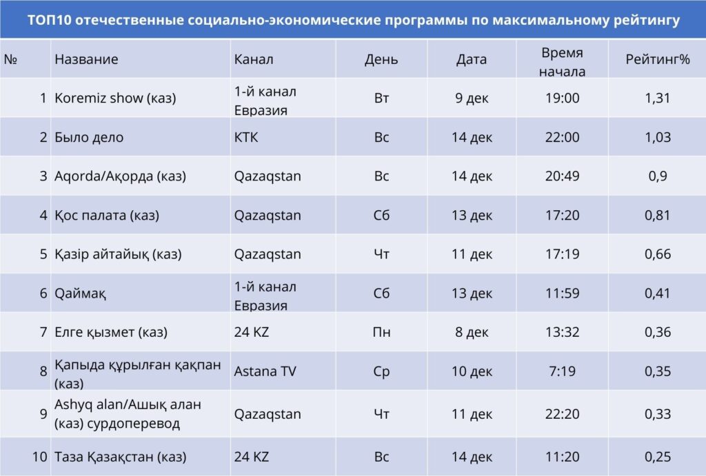 Социально‑экономический сегмент показал, что зрители ценят дискуссионные форматы и расследовательские передачи, а казахскоязычные проекты становятся ключевым инструментом вовлечения аудитории. Стабильный лидер топа- ток‑шоу с обсуждением актуальных социальных тем «Koremiz show» Первого канала Евразия. Вторая строчка у документально-постановочного проекта «Было дело» (КТК) и третья строчка у драйвера категории телеканала Qazaqstan c программой «Aqorda/Ақорда».
