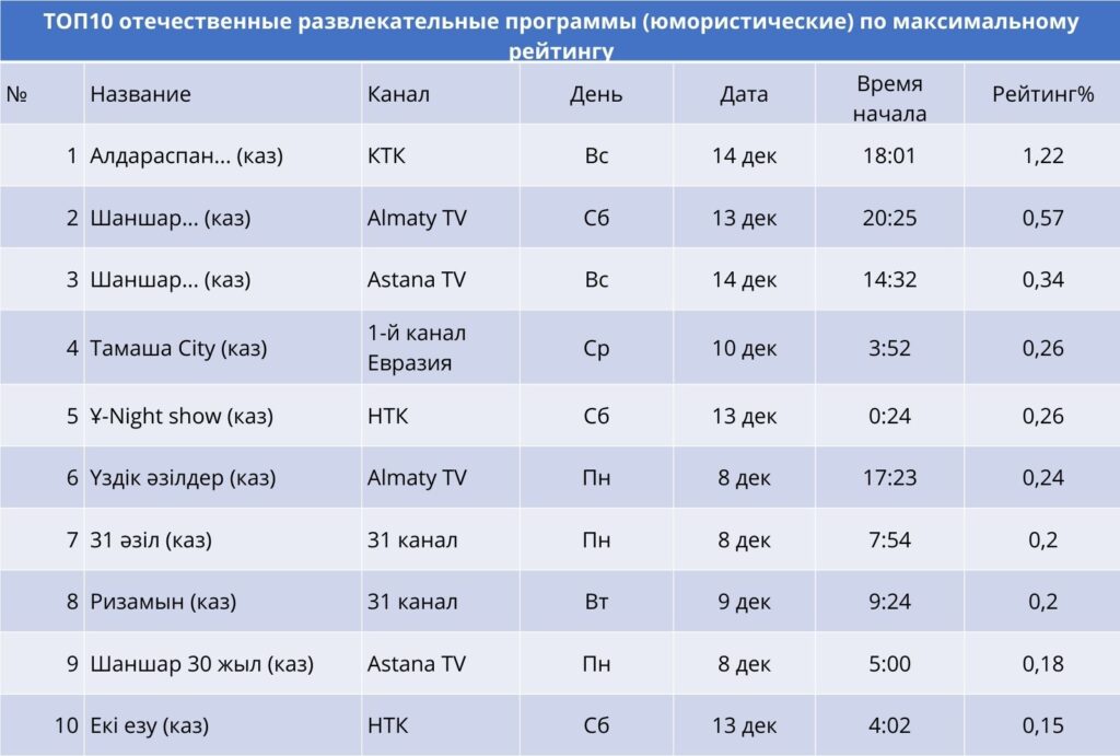 «Алдараспан» (КТК) стал лидером категории: воскресный выпуск собрал рейтинг более 1,22%, подтвердив статус одной из самых популярных юмористических программ страны. «Шаншар» занял вторую на Almaty TV и третью позицию на Astana TV, демонстрируя стабильный интерес к классическому юмористическому формату.