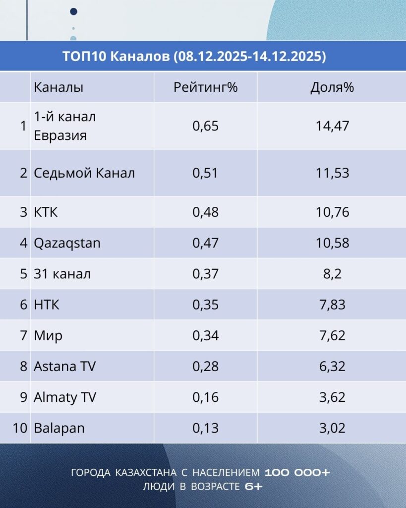 По итогам второй недели декабря лидером телесмотрения остается Первый канал Евразия — его среднесуточный рейтинг составил 0,65%, а доля аудитории достигла 14,5%. Главное изменение недели — на второе место перешел Седьмой канал с рейтингом 0,51% и долей 11,5%. Третью строчку занимает КТК (рейтинг 0,48%, доля 10,8%).
