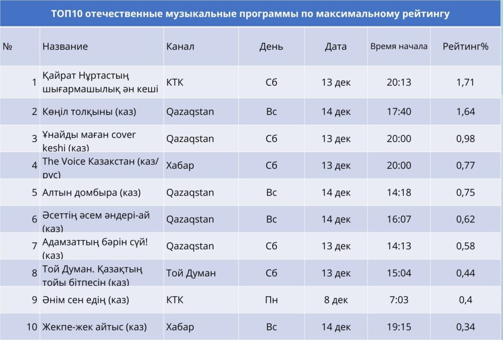 Музыкальные проекты второй недели декабря показали высокую вовлечённость аудитории в выходные дни, когда зрители предпочитают концерты и творческие вечера. Так «Қайрат Нұртастың шығармашылық ән кеші» (КТК) стал абсолютным лидером категории: субботний концерт собрал рейтинг более 1,7%, подтвердив статус певца как одного из самых популярных исполнителей страны. «Көңіл толқыны» и «Ұнайды маған cover кеші» (Qazaqstan) заняли вторую и третью позиции, укрепив позиции канала в музыкально‑развлекательном сегменте.