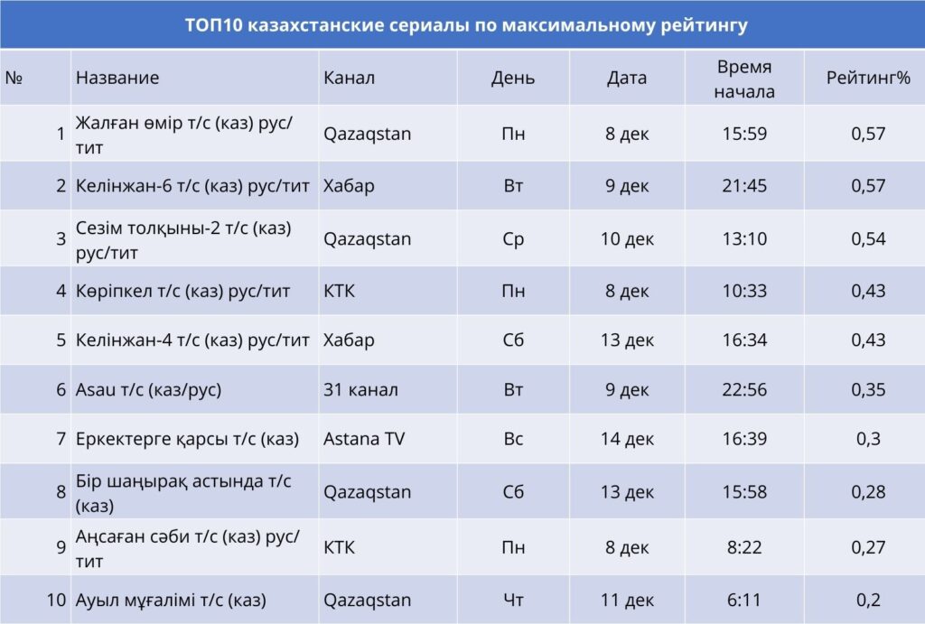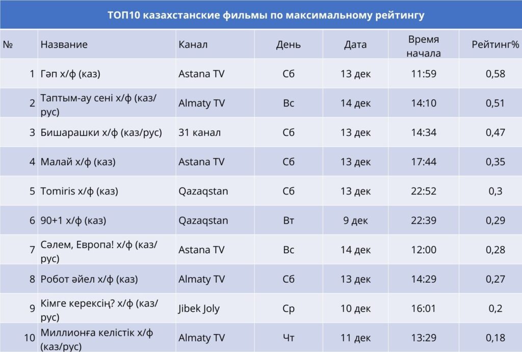 Во второй неделе декабря в топ‑10 вошли фильмы разных жанров — от комедий до исторических эпопей. А тройка лидеров выглядит так: «Гәп» (Astana TV) с рейтингом 0,58%, комедийный фильм с сатирическим подтекстом, где путешествие превращается в череду неожиданных событий; «Таптым‑ау сені» (Almaty TV) — второе место (0,51%), романтическая история, удерживающая внимание аудитории в воскресный слот, «Бишарашки» (31 канал) — третья позиция (0,47%), лёгкая комедия, ориентированная на массового зрителя.