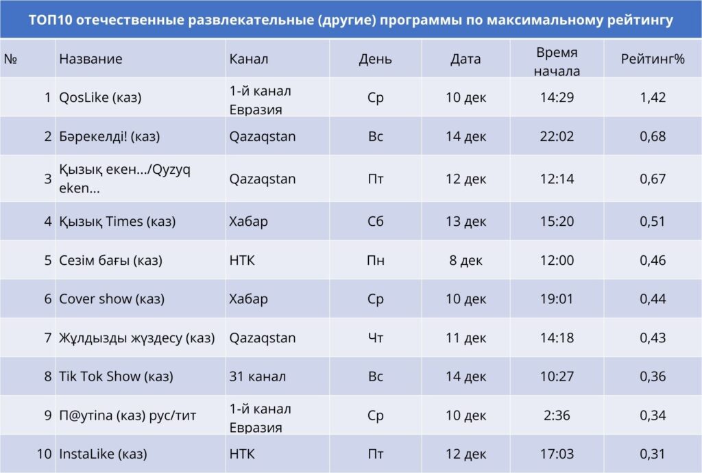 Сенімді көшбасшы – QosLike реалити-шоуы. Одан кейін Qazaqstan үлттық арнасының «Бәрекелді!» және «Қызық екен… / Qyzyq eken…» жобалары орналасты.