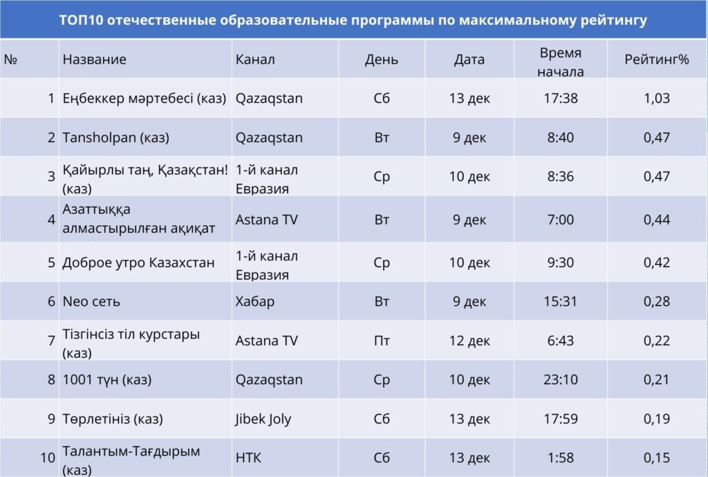 Еуразия бірінші телеарнасы да топта бірнеше позицияға ие болды: «Главные новости» мен «Басты жаңалықтар» жоғары рейтинг көрсетсе, сондай-ақ «Жаңалықтар» мен «Новости» бағдарламаларының жекелеген шығарылымдары үздік ондыққа енді.