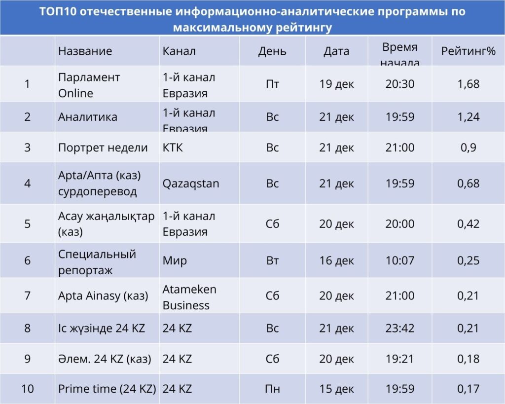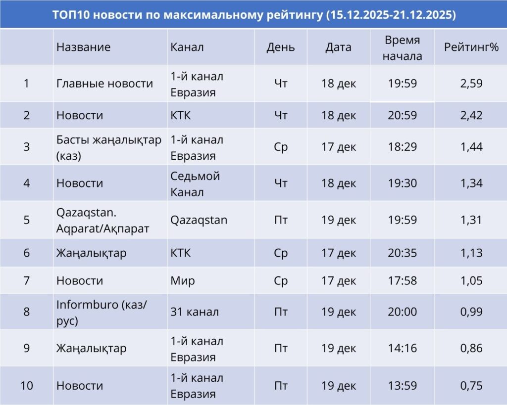 Телевизионные новостные программы традиционно остаются главным достоверным источником информации для казахстанцев. Лидером недели стал выпуск «Главные новости» на Первом канале Евразия с рейтингом 2.59%, за ними следуют «Новости» КТК (2.42%) и «Басты жаңалықтар» (каз.) на Первом канале Евразия (1.43%).