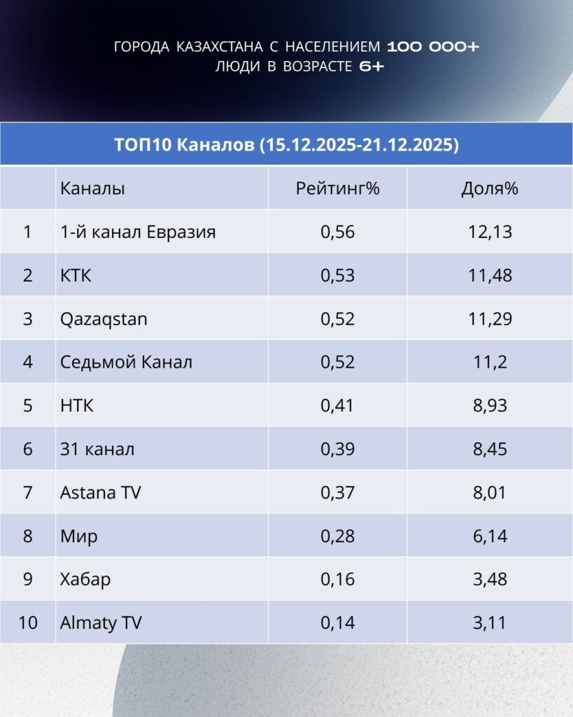 Первое место занимает Первый канал Евразия (рейтинг 0.56%, доля 12.13%), второе — КТК (0.53%, доля 11.48%), третье — Qazaqstan (0.52%, доля 11.29%). Главная новость недели — Qazaqstan потеснил Седьмой канал, который долгое время удерживал позицию в первой тройке.