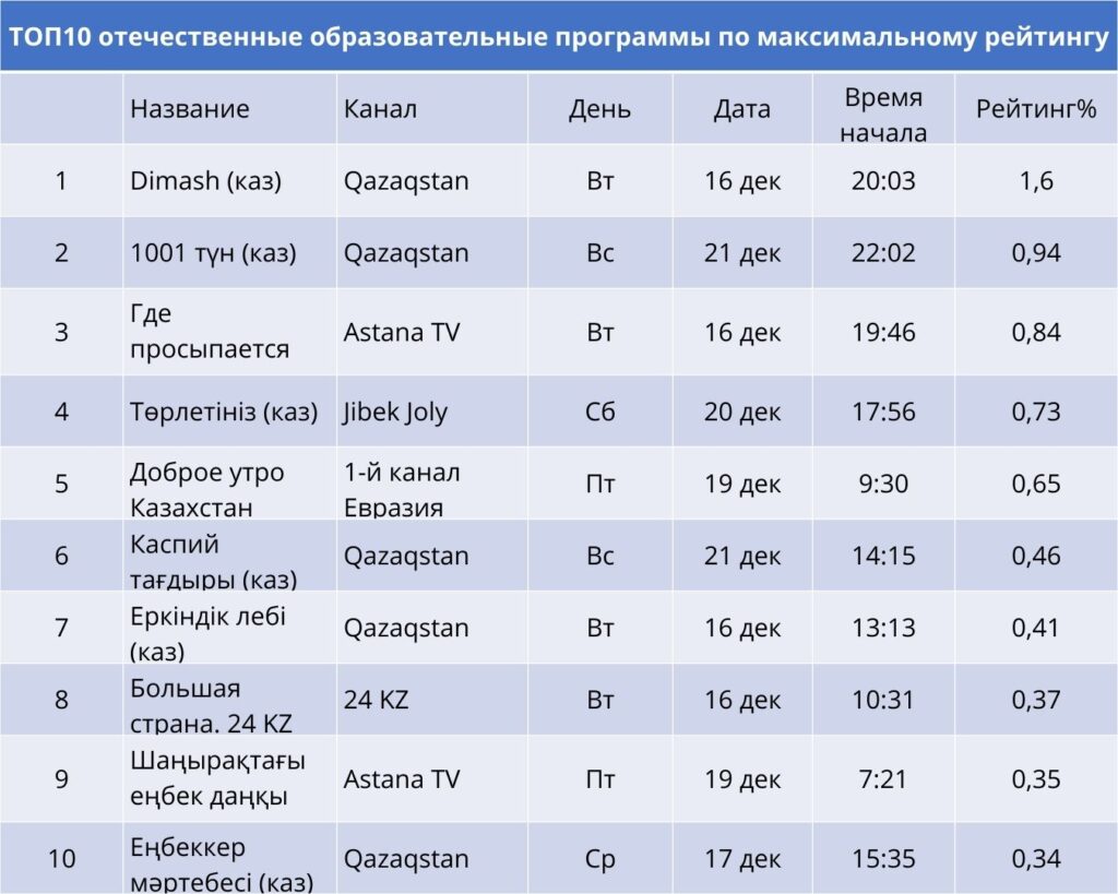 Познавательные передачи сохраняют свою ценность. Первое место занял проект «Dimash» (Qazaqstan) с рейтингом 1.60%, второе — «1001 түн» (Qazaqstan) (0.94%), третье — «Где просыпается детство» (Astana TV) (0.84%). Эти программы расширяют кругозор и находят отклик у аудитории, стремящейся сочетать отдых с интеллектуальным развитием. Доминирует к категории телеканал Qazaqstan, занявший своими проектами половину топ-10.