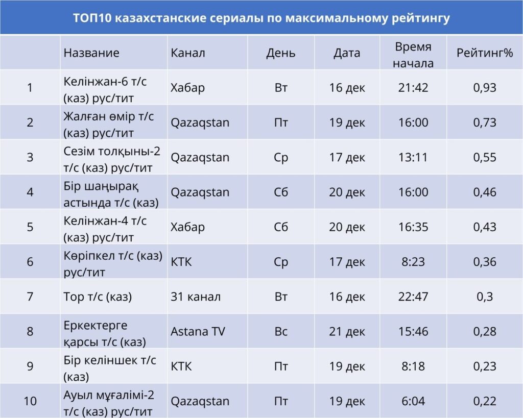Отечественные сериалы завоёвывают интерес и доверие зрителей, поддерживают культурные ценности, предлагая разнообразие жанров — от семейной драмы до романтики. Первое место занял проект «Келінжан-6» (Хабар) с рейтингом 0.93%, второе — «Жалған өмір» (Qazaqstan) (0.73%), третье — «Сезім толқыны-2» (Qazaqstan) (0.55%).
