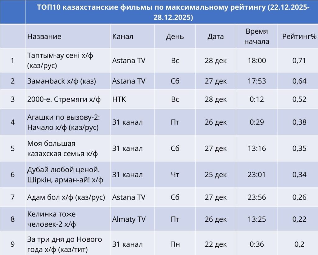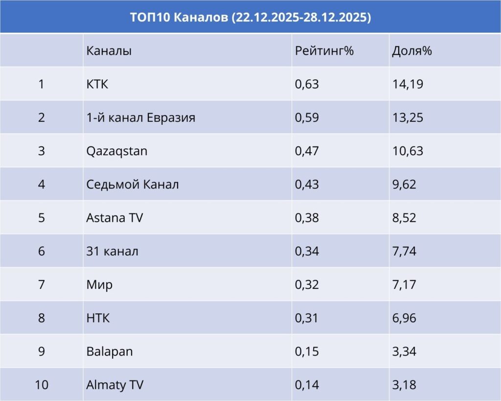 22–28 желтоқсан аралығындағы апта қорытындысы бойынша ұзақ уақыттан кейін алғаш рет көшбасшы ауысып, үздік үштік құрамында ротация орын алды. Бірінші орынға КТК арнасы шықты (рейтинг – 0,63%, үлесі – 14,2). Екінші орында – Еуразия бірінші арнасы (0,59%, үлесі – 13,3%), ал үшінші орында – Qazaqstan арнасы (0,47%, үлесі – 10,6%). Үздік бестікке сондай-ақ Жетінші арна (9,6%) және Astana TV (8,5%) кірді.