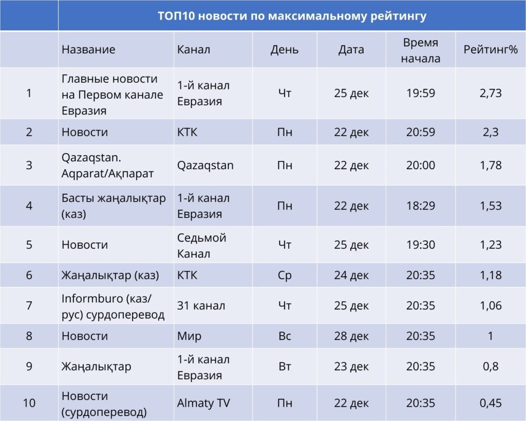 Көрермендер арасында дәстүрлі түрде күнделікті жаңалықтар шығарылымдары үлкен қызығушылық тудырды. Апта көшбасшысы – «Еуразия» Бірінші арнасындағы «Главные новости», рейтинг көрсеткіші – 2,73%. Екінші орында КТК арнасындағы «Новости» (2,30%), ал үшінші орында «Qazaqstan. Aqparat» ақпараттық бағдарламасы (1,78%). Телевизиялық жаңалықтар аудитория үшін әлі де негізгі сенімді ақпарат көзі болып қала береді.