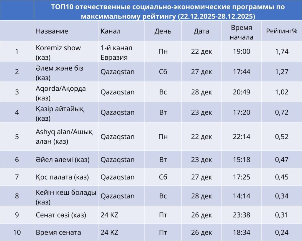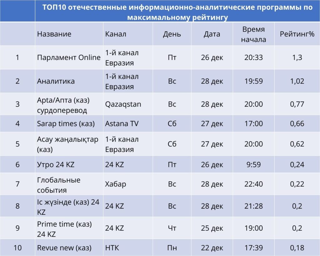 Талдамалық сегментте «Парламент Online» (1,30%) және «Аналитика» (1,02%) бағдарламалары («Еуразия» арнасы) сенімді түрде көш бастап тұр. Үшінші орында – Qazaqstan арнасындағы апталық шолу «Апта» (0,77%). Бұл көрсеткіштер көрермендердің, әсіресе саяси және қоғамдық тақырыптардағы пікір мен оқиғаларды талдауға қызығушылық танытатынын көрсетеді. Рейтингтің үш жолынан 24KZ және Qazaqstan арналары иеленді.